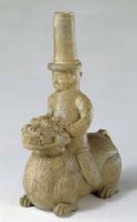 人騎于獸背,雙手握獸角,頭戴網(wǎng)紋卷沿高帽,帽中空,可插燭。騎獸人高鼻圓眼,頜下有須;獸則伏臥,齜牙瞋目。人、獸之身都戳印圓形紋,獸面篦劃須紋,長尾垂。通體施青黃色釉。