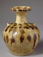 壺洗口,長(zhǎng)頸,豐肩,鼓腹,腹下內(nèi)收,平底。底部無(wú)釉,有支燒痕跡。肩部刻劃弦紋2道,四面分別飾一橫向系。外口凸起弦紋1道,器身施半截釉,釉色青黃,散布有垂淌的褐斑。