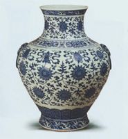 侈口,束頸,鼓腹,圈足。肩置鋪首銜環(huán)耳,頸部飾纏枝寶相花,肩部飾八吉祥圖案,腹下部繪仰蓮瓣紋,口沿和圈足飾海水江牙,共八組紋飾組成整體畫面。寶相花是一種具有象征意義的花,它集中了蓮花、牡丹、菊花的特征,是經(jīng)過藝術(shù)處理而成的更圣潔、更端莊、更美觀的理想花型,它與八吉祥相配即寓意吉祥如意。此尊造型工整,畫風古樸,青花顏色明快艷麗。