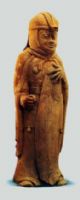 用陶俑陪葬在秦至唐代貴族墓葬中較流行,主要根據(jù)各時(shí)期官吏的形象雕塑而成,以顯示死者生前顯赫的地位。此俑出土于墓中,該墓共出土了近四十件陶塑,為研究隋代的墓葬習(xí)俗和陶塑藝術(shù)提供了寶貴的實(shí)物資料。在出土的陶俑中.只有兩件為守門武士俑,他們一手按盾,一手執(zhí)兵器(所執(zhí)兵器已脫落)。一為張口鼓目,面帶笑容,一為豎眉鼓眼,臉為怒容。