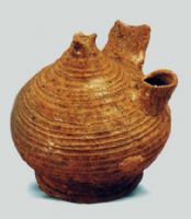 此盉形如撲滿,頂端作獸首狀,上腹一側(cè)附牛角式銎手,另一端有一流,全身均作弦紋環(huán)繞,青黃色釉。釉面光亮,保存完整。出土于屯溪3號墓中。此墓共出土了三件原始青瓷盉。