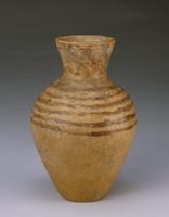 瓶陶質(zhì),敞口,束頸,鼓腹,腹下漸收,平底。器表光滑,上腹部彩繪弦紋六周,紋飾簡潔明快,樸素大方,有很強(qiáng)的裝飾性。此類弦紋是馬家窯文化中馬家窯類型彩陶的常見紋飾。