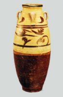 圓口,卷唇,長圓腹,平底微內(nèi)凹,近口處附四扁帶形系。施白釉至腹中部,并用褐彩繪草葉紋,草草幾筆,風(fēng)格粗獷,寫意生動。白地褐(黑)花品種,宋代北方磁州窯,它將中國繪畫藝術(shù)與制瓷工藝相結(jié)合,創(chuàng)造了一種富有筆情墨趣的瓷器裝飾新品種。磁州窯對各地制瓷業(yè)有廣泛影響,皆有燒制同類產(chǎn)品,形成了磁州窯系。此瓶是安徽蕭窯燒造的具有磁州窯風(fēng)格的瓷器。