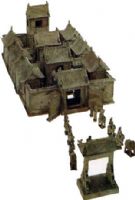 建筑群由一座牌坊和三進院落組成。五脊歇山式牌坊與大門之間分列騎馬俑二排。院門外有八字墻,門內有影壁,三進院以中軸對稱列出九座懸山式平房,一座堂樓,四個前后串通的門與圍墻。前院左角置陶轎,后院左廂置灶,左角有磨、杵臼、豬羊等,院內分立男俑17個,女俑10個。這套宅院是中國古代北方民居的真實寫照。