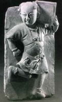 以泥質(zhì)灰陶塑成,作扛牌疾走狀。俑髡發(fā),耳后有兩個(gè)掏環(huán)髻,絳帶束蝴蝶結(jié),身著窄袖袒胸長袍,足蹬襪履。