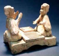 紅陶胎,底座與俑分模制作。座之兩側(cè)跽坐兩俑對(duì)博,中間置一長(zhǎng)方形盤局,其一邊置六根長(zhǎng)箸,另一邊置方形博局,博局兩邊各有六枚方形棋子,中間有兩枚圓“魚”。博局與俑皆施綠釉。
