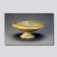 首都博物館藏。收口,淺盤式腹,喇叭形高足?谘赝鈧(cè)有三組貼塑裝飾。通體施青釉,釉層較薄而不均勻,胎呈淺灰色,造型不規(guī)整。