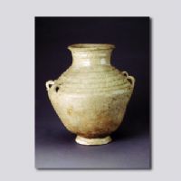 首都博物館藏。敞口,短粗頸,斜肩,折腹,圈足,足內(nèi)無(wú)釉。肩部貼有對(duì)稱(chēng)雙系,并飾五組刻花弦紋。通體施青釉,釉色淡青,釉面不均勻,胎質(zhì)堅(jiān)硬,呈淺灰色。它作為瓷器,尚不夠成熟,故稱(chēng)之為原始青瓷。