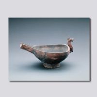 首都博物館藏。泥質灰陶。仿青銅禮器。敞口,淺腹,平底,鋬?yōu)轼B首狀,鳥尾為流。周身滿繪朱彩流云紋。