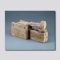 首都博物館藏。明器。施低溫綠釉,底座后端(即人操作處)的四角,各有一向上的支柱殘痕,推測(cè)支柱上面還應(yīng)有一扶手。碓為稻谷脫殼工具,大約發(fā)明于西漢,使用時(shí)踏碓人用足踏下杠桿將碓舉起來(lái),利用重力作用為稻谷脫殼。