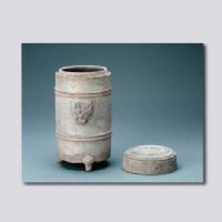 首都博物館藏。泥質(zhì)灰陶。筒形,直壁,平底,下承以三獸足,蓋面微弧。奩身上下各飾兩道凸弦紋,弦紋之間兩側(cè)各貼一獸面銜環(huán)鋪首。奩為盛化妝用品的容器,形式多樣,依據(jù)所盛物品的不同而不同,多見圓形,用以盛脂粉,也有方形或長方形,用以盛梳子、箅子及簪子等,也有的大奩中套小奩。