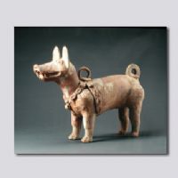 首都博物館藏。泥質(zhì)紅陶。明器。立姿?诓课,雙目前視,雙耳聳立,頸與胸之間有系帶,并連接著鏈環(huán),尾巴上卷,四肢直立有力,肌體壯碩,栩栩如生。