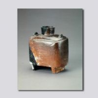 首都博物館藏。明器。直口,平肩,肩部兩側(cè)各有一個橋形系,長方形直腹,平底,底部有兩個倒梯形長直足。通體施低溫褐色釉,釉色不勻。