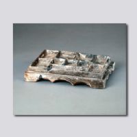 首都博物館藏。泥質紅陶。明器。長方形,共分為十個大小不等的格子。外施褐色釉,底部有座,并有弧形裝飾,是魏晉南北朝時期的典型隨葬器物之一,并且可作為中原地區(qū)墓葬分期的標準器物之一,流行于公元3世紀中期至5世紀末期。