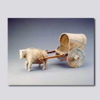 首都博物館藏。泥質(zhì)紅陶。明器。車為雙轅(已失),輿箱呈矩形,前面敞開,后面右側(cè)設(shè)一門,左右兩面全封閉,上連卷棚式車蓋,前后檐均較短,尤其是前檐較短是早期牛車的特征。輿箱底部有4個(gè)小孔用以固定車軸。車輪為模制,片狀,外側(cè)用雙線刻輻條。每輪輻條共16根,集中于粗圓的車轂上。車轂碩大也是當(dāng)時(shí)車輛的特征之一:古代車軸與車身相固定,行車時(shí)輪與轂轉(zhuǎn)動(dòng),轂上承車廂,下納輻條,還要耐得與車軸摩擦,故而體積較大。牛佇立于車前,作駕車狀,埋首引頸,肩峰高起,體態(tài)雄健,有將欲發(fā)車之勢,十分形象生動(dòng)。此牛車塑造寫實(shí),比例中規(guī)。牛車模型明器多見于南北朝時(shí)期的墓葬中。