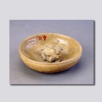 首都博物館藏。敞口,弧腹,平底,底部有支燒痕。周身施青釉,釉面泛黃,有開(kāi)片。圈內(nèi)臥一青釉狗。