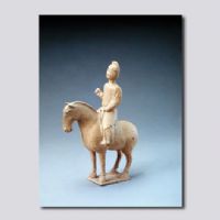 首都博物館藏。明器。男俑與馬俑為分別模制后再捏合一體,男俑頭戴幞頭,身著右衽窄袖圓領(lǐng)長袍騎于馬上,足蹬長靴,左手扶鞍橋,右手執(zhí)物(已失)。馬立于長方形扁平托板上,鞍韉俱全,神態(tài)馴順。通體施黃釉,釉面有細碎開片。