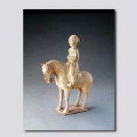 首都博物館藏。明器。騎俑與馬俑分別模制后在捏合成一體,通體施黃釉。頭發(fā)后梳,頭后有發(fā)髻。身穿右衽翻領(lǐng)窄袖胡服,腰束帶,衣紋自然下垂,足蹬長靴,雙手相合。其裝束近于男裝,真實(shí)地反映了當(dāng)時(shí)盛行女子以著男裝為時(shí)尚的社會(huì)風(fēng)氣,與史料 “開元初,從駕宮人騎馬者,皆著胡帽,靚妝露面,無復(fù)障蔽,……或有著丈夫衣服靴衫,而尊卑內(nèi)外斯一貫矣” 記載相吻合。馬立于長方形扁平托板上,鞍韉俱全,但無障泥及華麗的裝飾,反映了騎乘者身份比較低微,應(yīng)為侍女。