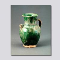 首都博物館藏。敞口,束頸,豐肩,收腹,玉璧底。肩部附短流和曲柄。通體施綠釉,施釉不到底,頸、肩、口、柄、腹等部分釉色有剝落現(xiàn)象。釉色青翠瑩潤,造型端莊大方。