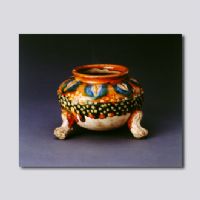 唇口,束頸,豐肩,鼓腹,圜底,下承以三獸足。爐口、頸施以深黃釉,肩部飾以三彩葉狀紋,層次分明,腹部施以藍(lán)、白釉。釉色色彩斑斕,黃、白、藍(lán)、綠等顏色相互交融浸潤(rùn),給人一種美的質(zhì)感。胎質(zhì)潔白堅(jiān)致,瑩潤(rùn)細(xì)膩。
