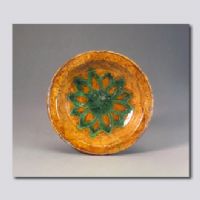 首都博物館藏?,折沿,弧腹,圈足,足內(nèi)無釉,內(nèi)外施黃釉,盤內(nèi)心刻團花,施綠彩。內(nèi)心有三個小支釘痕,外壁有輪制痕跡,胎體呈白色,釉面瑩亮,有細碎開片。