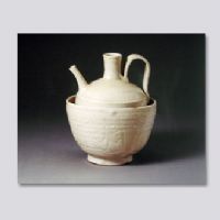 首都博物館藏。注壺和溫碗組成一套溫酒器。注壺口沿微侈,折肩,圓腹,脛內(nèi)收,圈足外撇。一側(cè)頸肩之間連以帶狀曲柄,另一側(cè)肩部置管狀流。通體施白釉,釉下施白色化妝土,足內(nèi)無釉有支燒痕,腹部刻折枝花,花紋淳樸自然。釉色白中泛黃,施釉較厚,釉面瑩亮,釉下有明顯的旋坯紋。溫碗敞口,深腹,圈足。通體施白釉,釉下有白色化妝土,外壁施釉不到底,內(nèi)心有四條支燒痕。外壁刻折枝花。胎質(zhì)略粗,胎體堅(jiān)實(shí)。注壺和溫碗為宋遼金時(shí)期流行的一套溫酒器,與盞托、盞盤配套使用。
