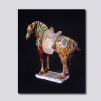 首都博物館藏。明器。馬立于長方形扁平托板上,馬頭左偏略下垂,表現(xiàn)瞬間動態(tài),極為自然生動。鬃毛飾綠彩,自然下垂。身體呈棗紅色,鮮麗明快,膘肥體壯,四肢健碩,腿部肌肉表現(xiàn)寫實,自然,應(yīng)為捏制。鞍韉齊備:頭有當(dāng)盧、絡(luò)頭、鑣、銜,頸佩攀胸、杏葉,背負鞍韉、障泥、馬鐙,尻飾秋、杏葉、束尾。鞍為后橋傾斜鞍,鞍后垂有鞘。鞍韉、障泥皆無釉,但裝飾華美、立體感很強,是主人身份高貴的象征。從其未罩鞍袱來看,應(yīng)是一匹正在騎用的良馬。唐三彩是對唐代三彩鉛釉陶的簡稱,以白色粘土為胎,用銅、鐵、鈷、錳等金屬為釉料的著色劑,使釉在燒制過程中粘度小,流動性大,易垂流、暈散并可降低燒制的溫度。其燒制工藝是兩次燒成,先在1100℃左右高溫下燒素坯,然后在已素?zé)^的胎體上施釉,再經(jīng)900℃低溫?zé)。一般有黃、綠、藍、白等多種色彩,以黃、綠、白色為主。唐三彩工藝始創(chuàng)于唐高宗時期,至玄宗時達到鼎盛,主要用于陪葬。