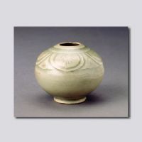 首都博物館藏。收口,豐肩,鼓腹,圈足,足脊無(wú)釉?谘叵驴谈采彴昙y,并劃出筋脈。內(nèi)外施青釉,口沿下有開片,釉層澄澈。胎體輕薄,造型精巧,是一件別具一格的文房用品。