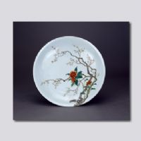 首都博物館藏。侈口,淺腹,圈足。以豆青釉為地,從外足繪茶、梅各一株,枝干由盤壁經(jīng)口沿至內(nèi)壁及盤底。紋飾以淡粉、褐、杏黃、珊瑚紅等色彩渲染。外底書青花雙圈“大清雍正年制”6字雙行楷書款,色調(diào)鮮麗柔和,充分表現(xiàn)出所繪紋飾濃淡不一和陰陽向背的質(zhì)感。將折枝花卉從器表畫到器里,枝桿相連,稱為過枝,是雍正時期的一大特征。