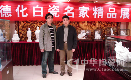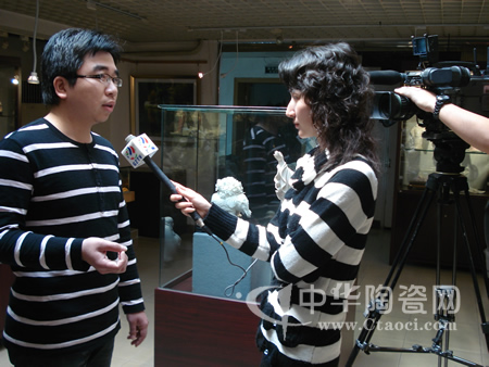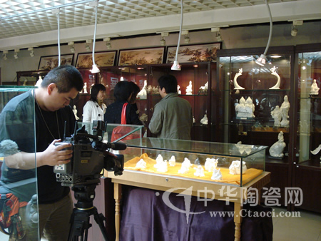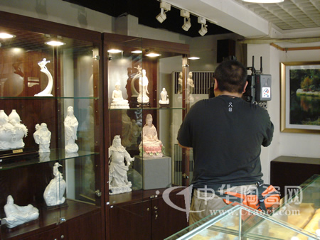 中華陶瓷網(wǎng)副總經(jīng)理蘇世偉在向廣州電視臺記者介紹德化陶瓷