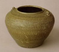 說 明: 原始瓷器。器表示青黃色釉。造型樸實莊重,釉面晶亮。