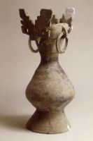 說 明: 泥質(zhì)灰陶。方形口,細(xì)長徑。造型別致,裝飾華麗。