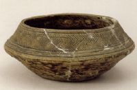 說(shuō) 明: 斂口、斜肩、扁折腹、平低。在肩部的劃紋間飾連續(xù)曲折紋帶條裝飾。