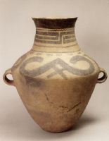 說 明: 泥質(zhì)土黃陶。造型莊重,花紋樸實(shí)。