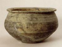 說 明: 泥質(zhì)灰黑陶。斂口、沿外卷,圓唇、深腹扁圓鼓。