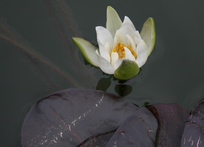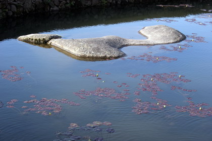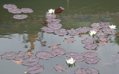在石壺殿門殿門前半月池里,時(shí)值正午,正逢石牛山一寶、世間少有的午時(shí)蓮盛開,紫中泛綠的蓮葉,襯托著細(xì)巧的黃芯白花,倒映水中,鯉魚競翔追逐,激起波波漣漪。