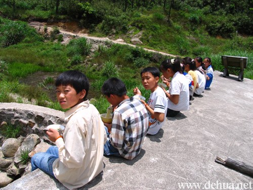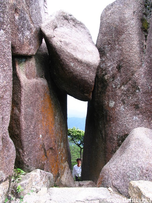 上午九點(diǎn)陽(yáng)光燦爛,心情也隨之晴朗,我們見(jiàn)到幾位小學(xué)生在在蓮花峰游玩,這群小伙伴昨晚上山原本要找尼姑庵,卻迷了路,在夜晚七點(diǎn)發(fā)現(xiàn)廣欽寺,被寺中僧人收留,安排住宿和伙食,第二天還帶著小學(xué)生到山尋趣,恰巧成了我們拍攝的模特。主峰蓮花峰是叢林中拔地而起的一座小山峰,由一大堆瓣?duì)羁v裂的花崗石組成。遠(yuǎn)觀,像一朵蓮花含苞待放;再遠(yuǎn)眺,則如盛開(kāi)蓮花。小學(xué)生在蓮花峰舞動(dòng)雙手大聲向我們呼喊。獅子峰是一座巨大的石峰,凜然云表,形狀如同一只傲視蒼天的雄獅。