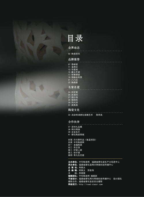 經(jīng)過兩個月的努力,中華陶瓷網(wǎng)旗下《陶瓷之路》第三期正式發(fā)布,電子版同步上線,歡迎大家下載查看,第三期雜志封面使用300克銅版紙,內(nèi)頁使用200克銅版紙,第三期將在全國最大禮品展深圳禮品展(達4500個展位,人流量達12萬)、第四屆中國(莆田)海峽工藝品博覽會、2009中國(蘇州)國際工藝美術精品博覽會、第十屆沈陽國際禮品工藝品暨家用精品展覽會等展會上發(fā)行。本期雜志頁數(shù)為56頁,設計、印刷精美,歡迎廣大需要采購陶瓷禮品的客商、禮品公司免費索取。