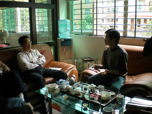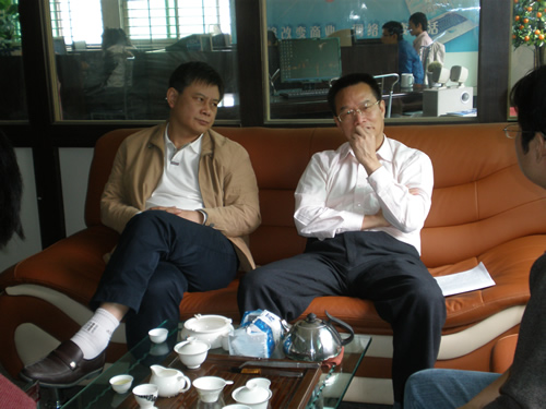 中華陶瓷網(wǎng)總經(jīng)理柯維太(右) 向州市科技局黨組成員、紀檢組長——陳嘉祐(左)介紹