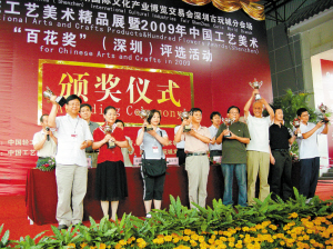 據(jù)組委會(huì)負(fù)責(zé)人介紹,本次共有1460件作品入圍,經(jīng)層層評(píng)選,連紫華的陶瓷作品《西方三圣》、陳明良的陶瓷作品《童子拜觀音》、于涇的玉雕作品《5·12》等72件作品獲金獎(jiǎng);顧啟望、呂志賢的翻簧竹刻作品《蘭閨雅集圖》等94件作品獲銀獎(jiǎng),另外,還評(píng)出銅獎(jiǎng)89件,優(yōu)秀獎(jiǎng)98件,創(chuàng)意獎(jiǎng)19件,工藝獎(jiǎng)19件。其中既有許多德藝雙馨的工美大師的精品大作,也有很多年富力強(qiáng)的中青年工美技師的代表力作,還有不少初出茅廬的工美新生代的處女作,基本上代表了我國工藝美術(shù)最高水平,體現(xiàn)出了當(dāng)今中國工藝美術(shù)行業(yè)產(chǎn)地和項(xiàng)目相對(duì)集中、種類多姿多彩、市場日趨成熟、創(chuàng)作隊(duì)伍不斷擴(kuò)大、優(yōu)秀作品層出不窮、百花齊放、爭芳斗艷的大好局面。不少作品的工藝精湛、手法嫻熟,很好地繼承和發(fā)揚(yáng)了各個(gè)工藝美術(shù)門類的傳統(tǒng)特色;還有一些創(chuàng)新之作取材新穎、構(gòu)思獨(dú)特,非常富有時(shí)代氣息。其中來自上海玉雕大師于涇先生的反映四川汶川大地震的作品《5·12》就是一件具有深刻影響力和強(qiáng)烈的震撼力的工美佳作。