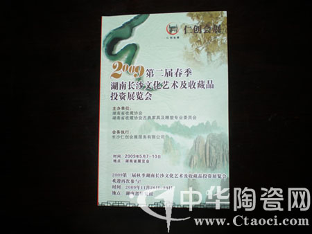 由湖南省收藏協(xié)會、湖南省收藏協(xié)會古典家具及雕塑專業(yè)委員會共同主辦的“2009第二屆湖南長沙文化藝術(shù)及收藏品投資展覽會”于2009年5月10日在湖南省展覽館圓滿閉幕。榮獲中國行業(yè)電子商務(wù)網(wǎng)站100強的中華陶瓷網(wǎng)成為本次展會合作媒體,進一步宣傳了展會情況及中國文化的底蘊。