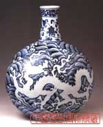 此瓶是由景德鎮(zhèn)御窯廠制造的。它圓口、長(zhǎng)頸、扁圓腹、平底,腹的兩面飾滿青花海水,各有一條白龍,揚(yáng)爪騰身,出沒(méi)于驚濤駭浪之中,頸部用青花飾以卷草紋、纏枝蓮紋各一道。這是宣德年間(公元l426~l435年)青花瓷器中的典型產(chǎn)品。明永樂(lè)、宣德年間是中國(guó)青花瓷器生產(chǎn)的成熟階段,其產(chǎn)品以造型清秀典雅,胎體薄,紋飾凝重,青花顏色鮮艷而著稱于世。