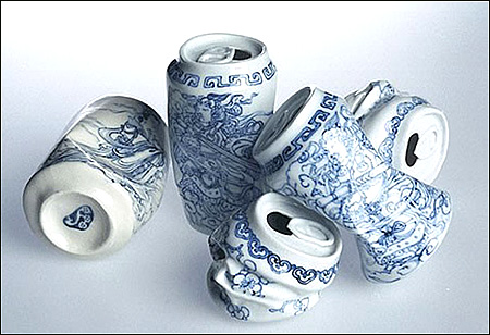 這幾個易拉罐是按照1:1設(shè)計制作,外觀采用了中國傳統(tǒng)的“青花”工藝,圖案也是中國的神話人物。設(shè)計師是Lei Xue,出生于中國青島。準(zhǔn)確的說,這是易拉罐造型的青花瓷藝術(shù)品,十分有意思。