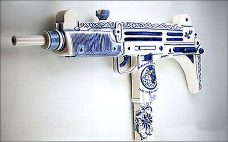 這支陶瓷槍有點(diǎn)像奧地利 MPi69 9mm沖鋒槍,MPi69 是1960年代的優(yōu)秀沖鋒槍之一。這支陶瓷槍整體均是陶瓷工藝,上面的圖案是手工畫上去的,感覺有點(diǎn)像中國的青花,由藝術(shù)家Charles Wing Krafft 設(shè)計制造。賣價:1800美元。