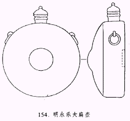大扁壺 壺式之一,明永樂時(shí)期創(chuàng)燒。小直口,頸部凸起一棱,并有一小系,有蓋。壺身為立扁圓形,正面微鼓,中心有圓形凸臍;背面平坦,中有相應(yīng)的圓形凹臍。底部為弧面。左右肩部各有一活環(huán)系。均為青花制品。正面凸臍上多繪八角星紋,外圍有的繪纏枝蓮,邊緣為海水紋,側(cè)壁一周繪纏枝蓮紋。背面無紋飾。器形仿西亞金屬器皿,其用途有待考證。