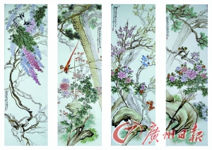 景德鎮(zhèn)粉彩藝術(shù)大師張景壽作品《花鳥四屏》(部分)。