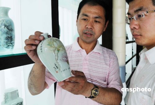 由山東省工藝美術(shù)大師、陶瓷藝術(shù)大師李秋峰歷時半年創(chuàng)作的一百四十件刻花魯青瓷梅瓶,于六月三十日啟運(yùn)上海世博會。在這一百四十件高零點(diǎn)二0米的刻花瓷瓶上,刻有上海市花玉蘭花和象征臺灣的蝴蝶蘭,還有“世博緣兩岸滬臺青少年千人歌會特別紀(jì)念二00九 上海”字樣。這批魯青瓷梅瓶將于上海世博會期間,贈送給前來參加活動的臺灣各學(xué)校的校長。圖為山東省工藝美術(shù)大師、陶瓷藝術(shù)大師李秋峰(左)在展示刻花魯青瓷梅瓶。