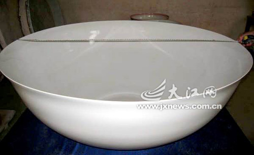 由景德鎮(zhèn)精心燒制完成的一只白薄胎大瓷碗和一塊大白瓷板近日面世。大瓷碗直徑1.23米、高1.58米、厚度為1.7毫米,形如一只大浴盆;白瓷板長(zhǎng)3.68米、寬1.58米,也碩大無(wú)比。經(jīng)有關(guān)專家和景德鎮(zhèn)陶瓷協(xié)會(huì)鑒定,兩件作品系景德鎮(zhèn)陶瓷燒造有史以來(lái)同類品種中單體尺寸最大、拉坯制作工藝最難的作品,堪稱“碗王”、“板王”。據(jù)悉,兩件作品正在申報(bào)吉尼斯世界紀(jì)錄。