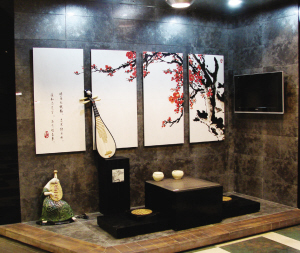 書(shū)法瓷磚對(duì)準(zhǔn)了人們懷舊古時(shí)文化的眼光,以隨性取勝,這種氣息更賦予了房間沉穩(wěn)、書(shū)香的氣度,甚至讓人錯(cuò)亂了對(duì)時(shí)空的認(rèn)知。唐朝詩(shī)人張旭的草書(shū)《古詩(shī)四帖》、《金剛經(jīng)》的段落、《大唐金甲》等都成為仿古瓷磚上的“表面文章”.除了不同字體的書(shū)法作品外,作為房屋裝修主力的瓷磚在學(xué)識(shí)上并不呆板單一,一首王安石的《梅花》詩(shī)旁配飾了一幅傲骨錚錚的梅花圖,詩(shī)句部分的瓷磚僅占梅花圖瓷磚大小的三分之一。而且墻磚上的文字不只局限于漢字,一段梵文的古經(jīng)被附于墻磚之上,盡管研究梵文的人不多,但對(duì)于偏“冷門(mén)”文字的上書(shū)表明了瓷磚文化的多元廣大。