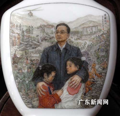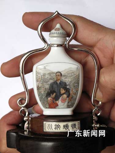 工藝美術(shù)師、微畫家吳永康歷時四個月,在一個小鼻煙殼上創(chuàng)作出一幅三點五厘米乘三點七厘米見方的微瓷畫“情暖汶川”,以總理溫家寶為主體,以各救援場景為背景,畫中繪出六十六個人物,細微之處,只有芝麻一半細小的人物臉部表情也清晰可見,落墨如絲,微妙生輝,其畫線只有發(fā)絲的三分之一,線條和文字的細小都創(chuàng)下了微瓷畫記錄,畫之精美,可謂在陶瓷上繡花。圖為吳永康的“情暖汶川”微瓷畫。